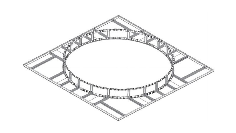 Esta combinación consiste en un techo circular sin canales de luz. Se ensambla con quillas de revestimiento de 50x30, quillas laterales, quillas curvas, conectores de revestimiento lateral, fijaciones y conectores giratorios. El soporte vertical utiliza quillas de revestimiento de 50x30, y las quillas superiores y de conformación son curvas.