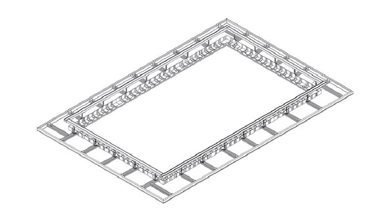 Esta combinación consiste en un techo de canto recto sin canal de luz. Se ensambla con quillas de 50x30, quillas de borde, quillas de canal de luz curvas, conectores de borde, fijaciones y piezas de nivelación superior e inferior. Cuando la altura del techo es de 110 mm < 180 mm, el soporte vertical utiliza piezas de nivelación superior e inferior de 110 mm a 180 mm.